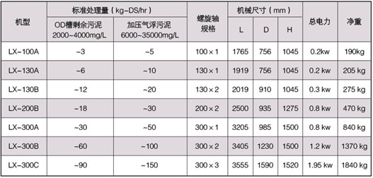 注:1、上表為參考值,處理量取決于污泥的性質和濃度。