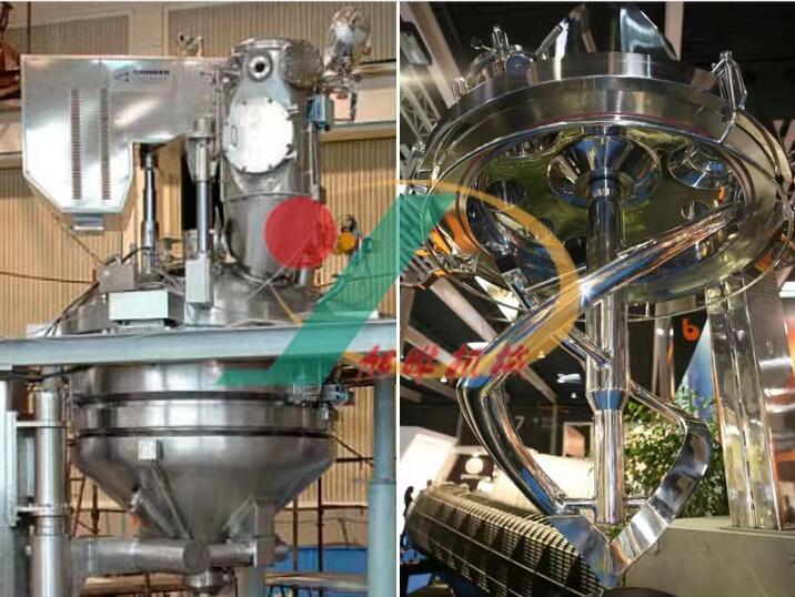 多功能過濾機設(shè)備內(nèi)部有特殊結(jié)構(gòu)的攪拌裝置進(jìn)行攪拌,該攪拌裝置通過頂部電動機及減速機等驅(qū)動裝置驅(qū)動,并通過液壓裝置驅(qū)動,可使攪拌裝置上下運動,以實現(xiàn)對反應(yīng)、過濾、洗滌及干燥物料等的不同攪拌和出料需要。中部圓筒體外有夾套進(jìn)行加熱,底部過濾面下方也可設(shè)置加熱裝置進(jìn)行加熱,以滿足干燥時對物料的加熱要求,必要時還能設(shè)置空心軸和空心攪拌裝置同時對物料進(jìn)行內(nèi)加熱,大大提高本機對物料的千燥效率。本設(shè)備在中部筒體的側(cè)向下方設(shè)置有特殊結(jié)構(gòu)的液壓自動排料裝置,以便過濾濾餅或干燥好的物料被密閉自動排出。